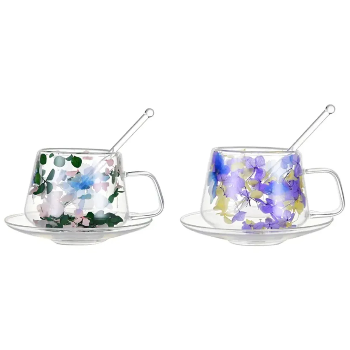 (Product Visual: Two double-walled glasses displayed side-by-side against white backdrop. Left: Vibrant pink/blue blooms with green foliage. Right: Rich purple floral arrangement. Each set includes glass cup, transparent saucer, and stirring rod.)