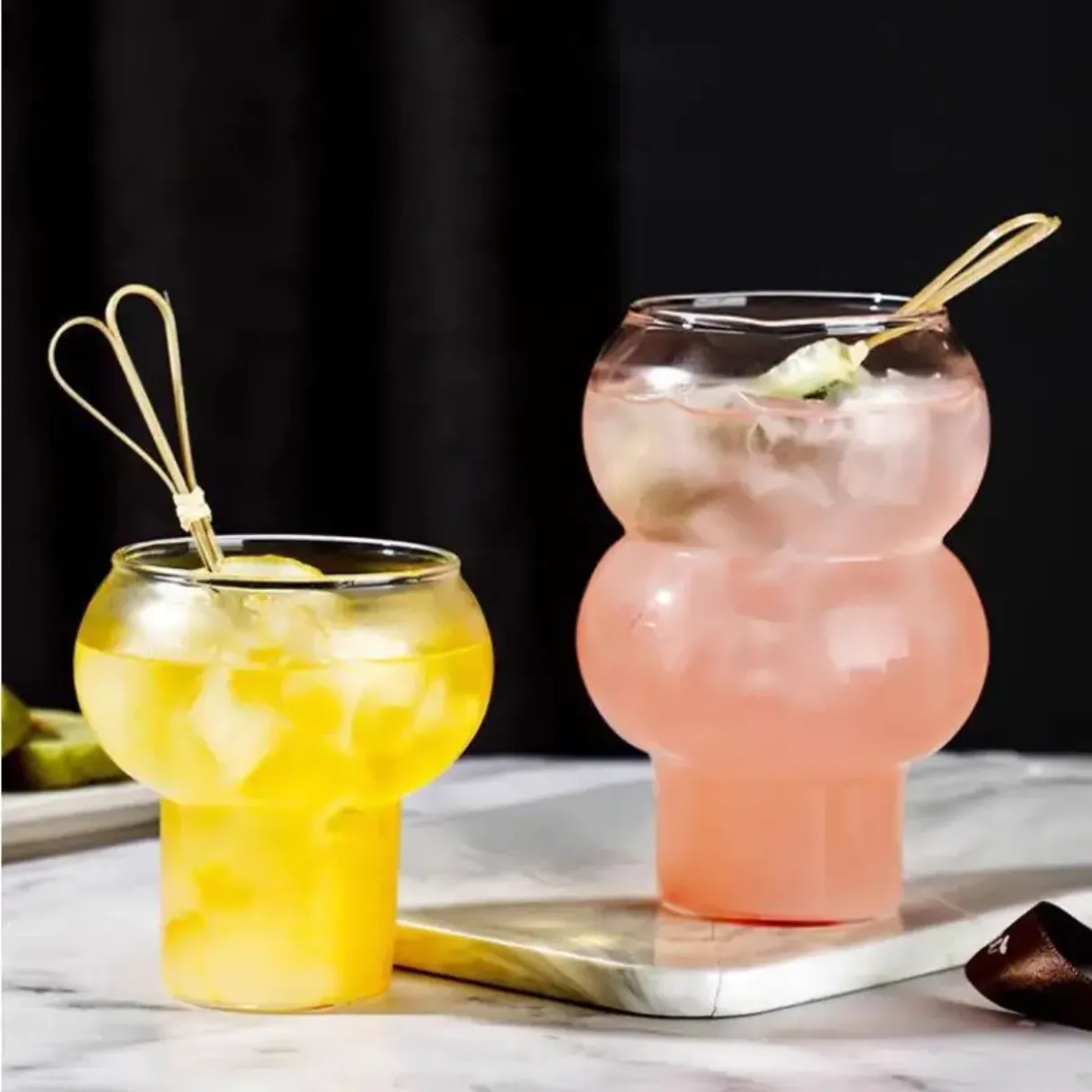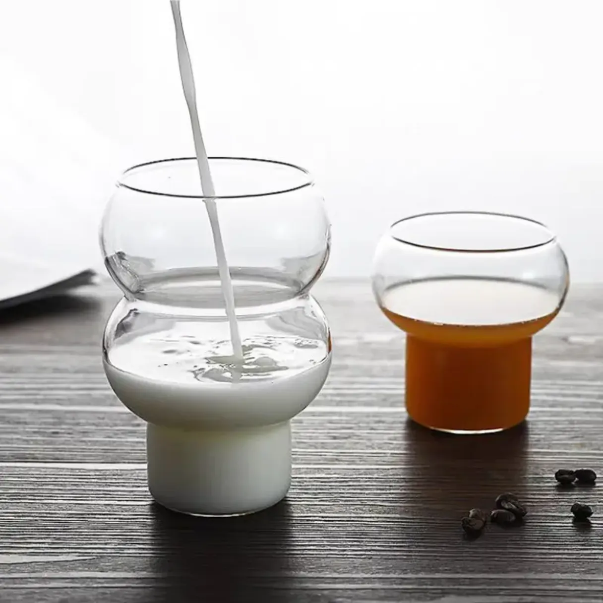 Both cups feature a unique rounded silhouette with a cylindrical base, combining visual appeal with stability. The transparent high borosilicate glass showcases the vibrant colors and layers of your drinks—making every beverage Instagram-ready!