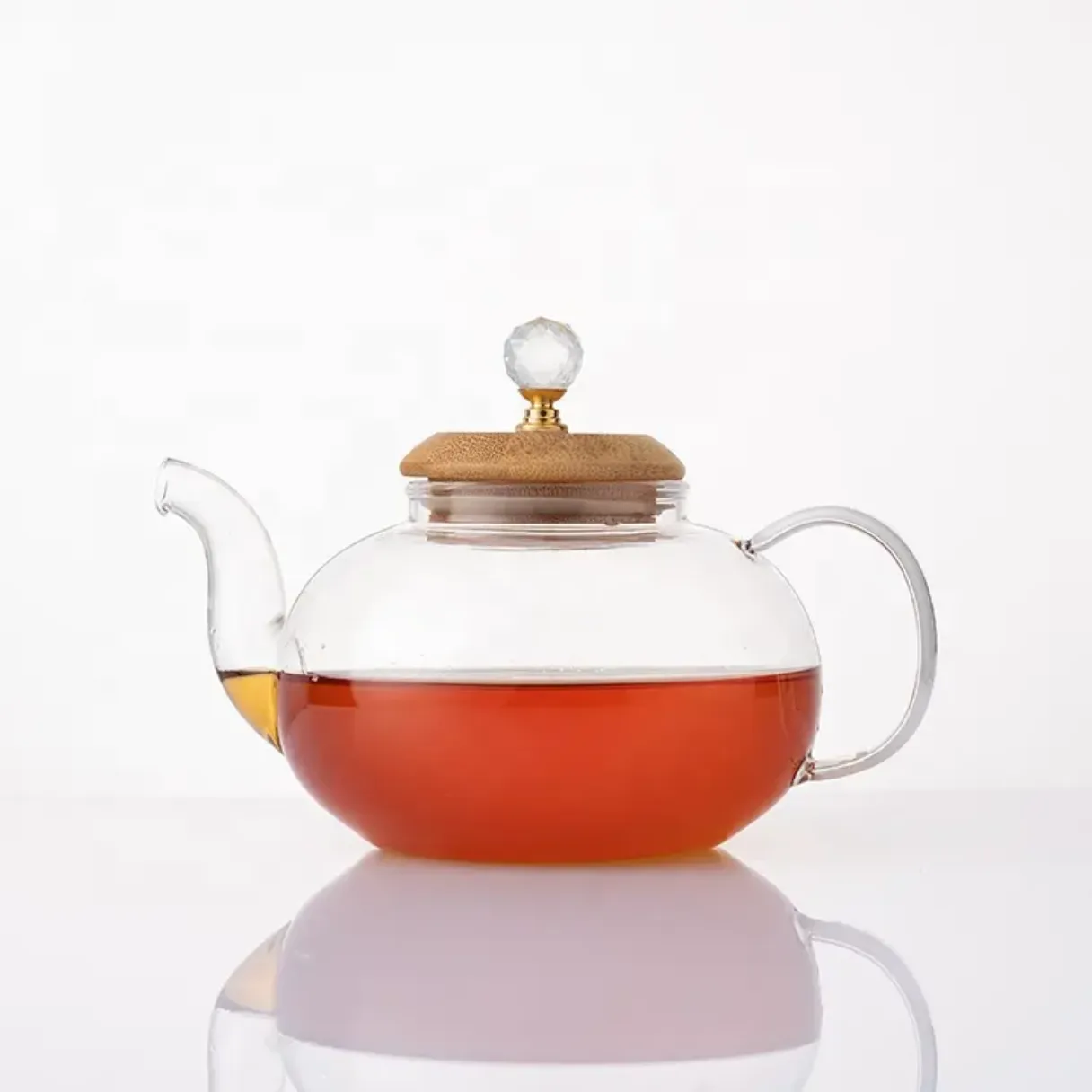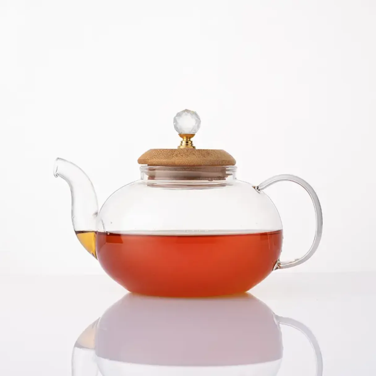 Topped with a finely crafted bamboo lid, this teapot adds a touch of organic warmth to your tea setup. The bamboo’s natural grain patterns celebrate sustainability and style, while the PP diamond-shaped ball knob offers a secure grip and a sparkling visual accent. The minimalist design, showcased against a pure white background, highlights the teapot’s transparency and the rich color of your tea, turning every brew into a visual delight.