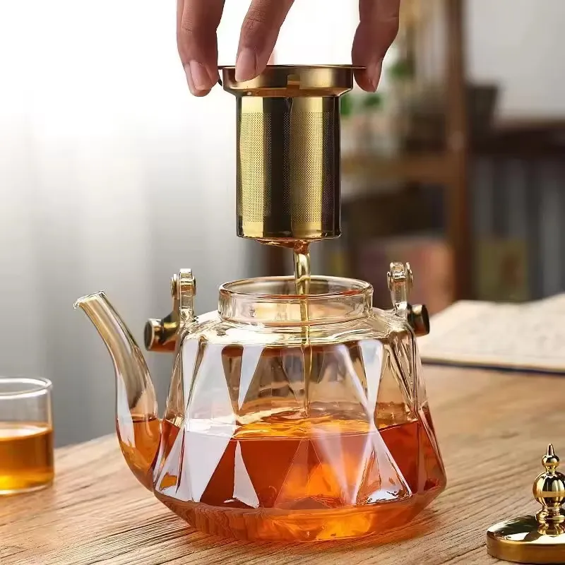 - The image captures the kettle’s allure: its translucent glass body glows with the rich warmth of tea, while the gold-plated accents highlight its premium craftsmanship. Whether displayed on a sleek countertop or held gently in hand, the diamond-cut design and glossy finish make it a centerpiece that elevates any table setting.
