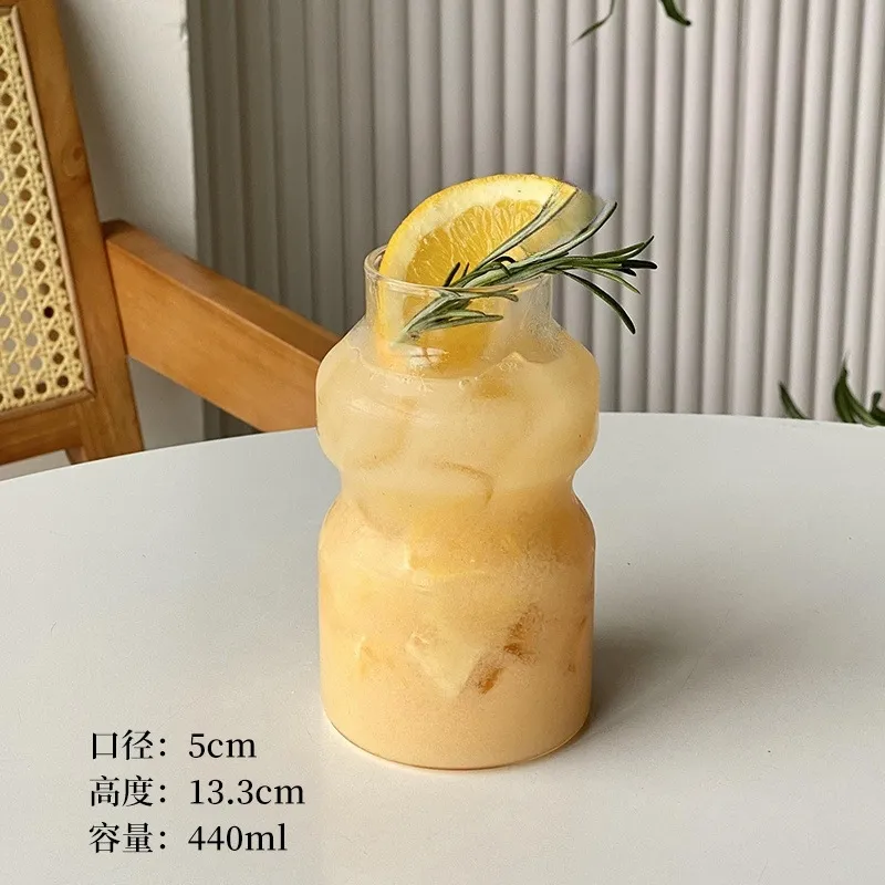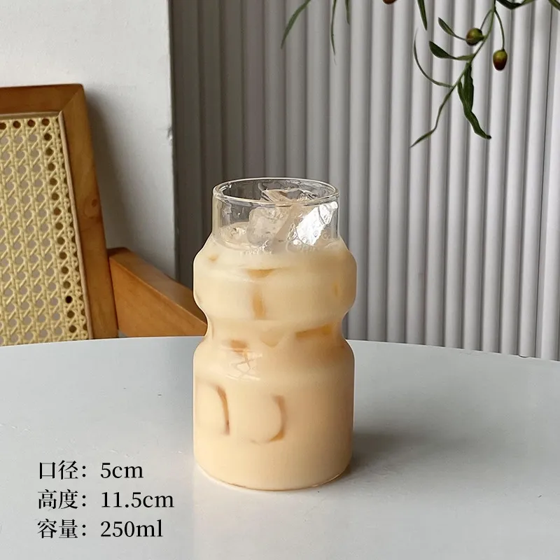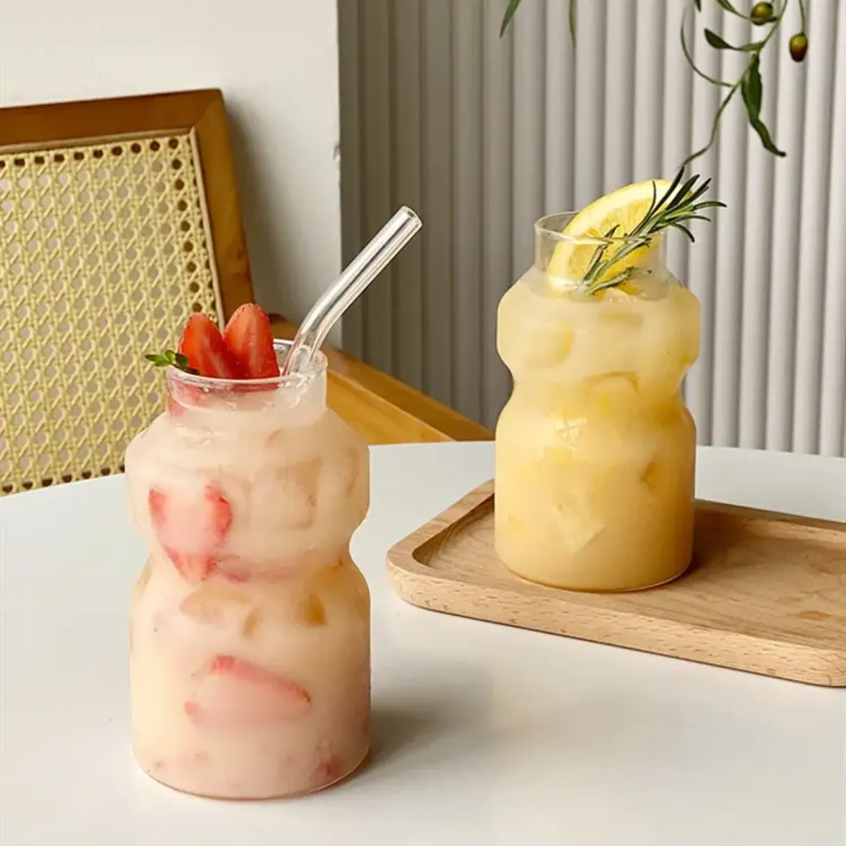 The transparent glass beautifully showcases layered drinks, from iced lattes with creamy foam to herb-infused beverages. The subtle texture on the smaller cup adds visual interest, while the minimalist taller cup emphasizes functionality. As seen in the images against a backdrop of vertical stripes, wooden accents, and greenery, these cups blend seamlessly into cozy, natural settings—whether at home, in cafes, or during outdoor gatherings.