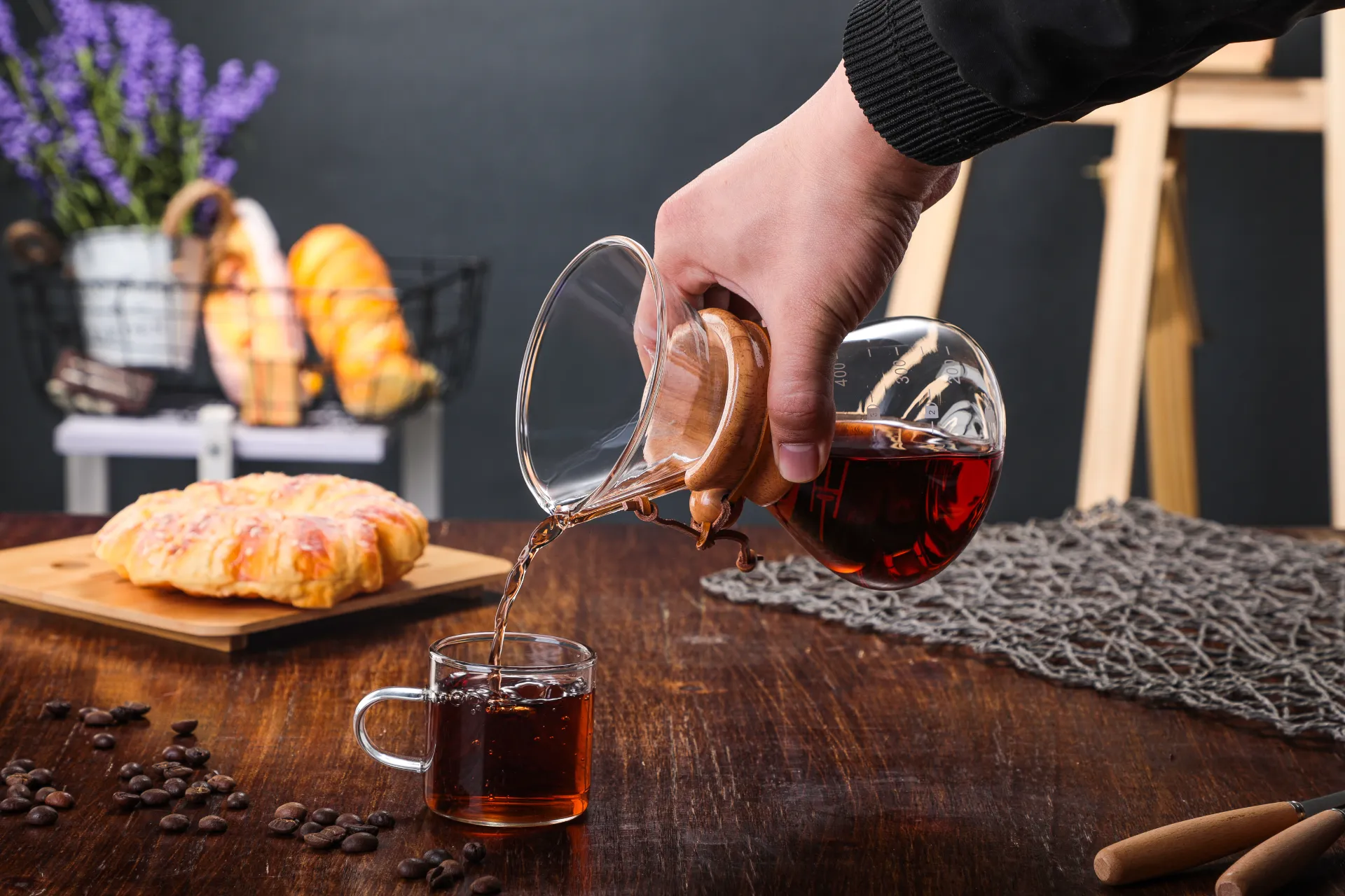One of the most distinctive features of this coffee pot is the wooden handle wrapped around its waist. This ergonomically designed wooden handle not only adds a touch of natural elegance to the pot but also serves a crucial practical purpose. The wood acts as an excellent insulator, effectively preventing heat transfer from the hot glass to your hands. This means you can comfortably grip the pot even when it's filled with steaming hot coffee, eliminating the risk of burns and making the pouring process a breeze. The smooth finish of the wooden handle provides a secure and comfortable hold, allowing for precise control as you pour your coffee into cups, whether you're serving a single cup or a full carafe.